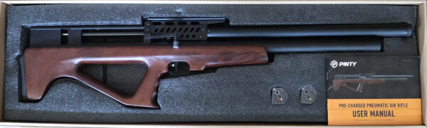 The Pinty Striker .25 Cal PCP Bullpup. This is one solid and affordable PCP Bullpup. This is the exact air rifle I reviewed on my February 13, 2026, review video. This rifle is “As New” and has approximately 100 shots through it. The trigger has been adjusted to a crisp 1 lbs. 15 oz.” This rifle is fully regulated with a 3625-psi maximum fill pressure. This comes with two (2) 8-round magazines and a complete spare seal kit. The hard-wood stock is stunning, and the rifle is all metal, including the picatinny scope rail. This rifle is an outstanding performer in both accuracy and velocity. Check out the video which will show you the exact performance of this rifle. “Happy Shooting!”